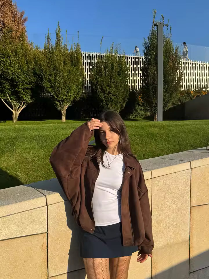 The Lara Suede Bomber Jacket is a modern take on the classic bomber, designed to bring effortless style and comfort to your wardrobe. Crafted from 100% premium polyester with a suede finish, it offers a soft touch and durable structure that makes it perfect for layering through different seasons. Featuring a relaxed oversized fit, a zip-up front, and a gathered hemline, it strikes the balance between laid-back streetwear and polished sophistication. The collared neckline adds a timeless touch, while the slightly dropped shoulders and wide sleeves create a chic, contemporary silhouette.